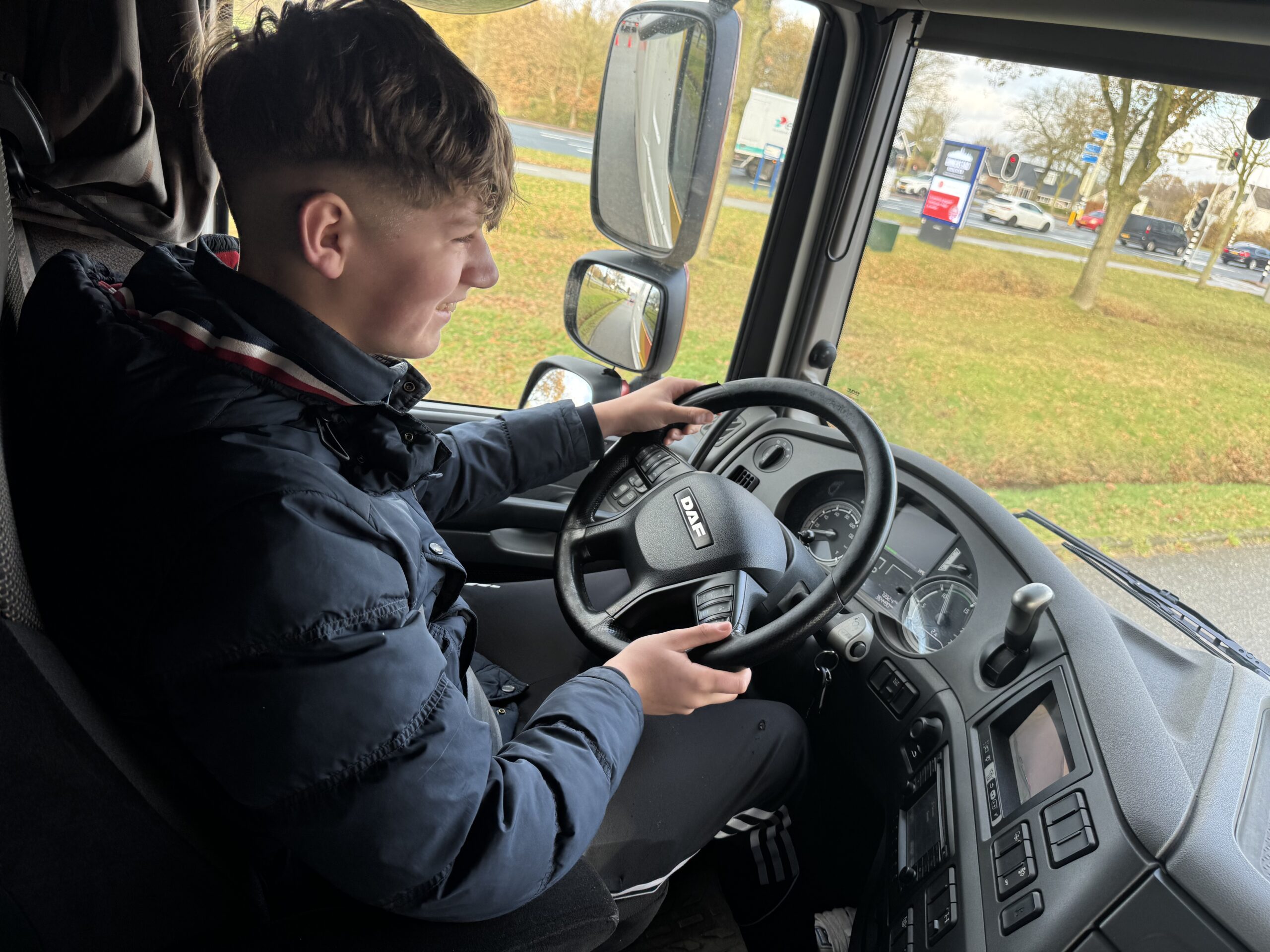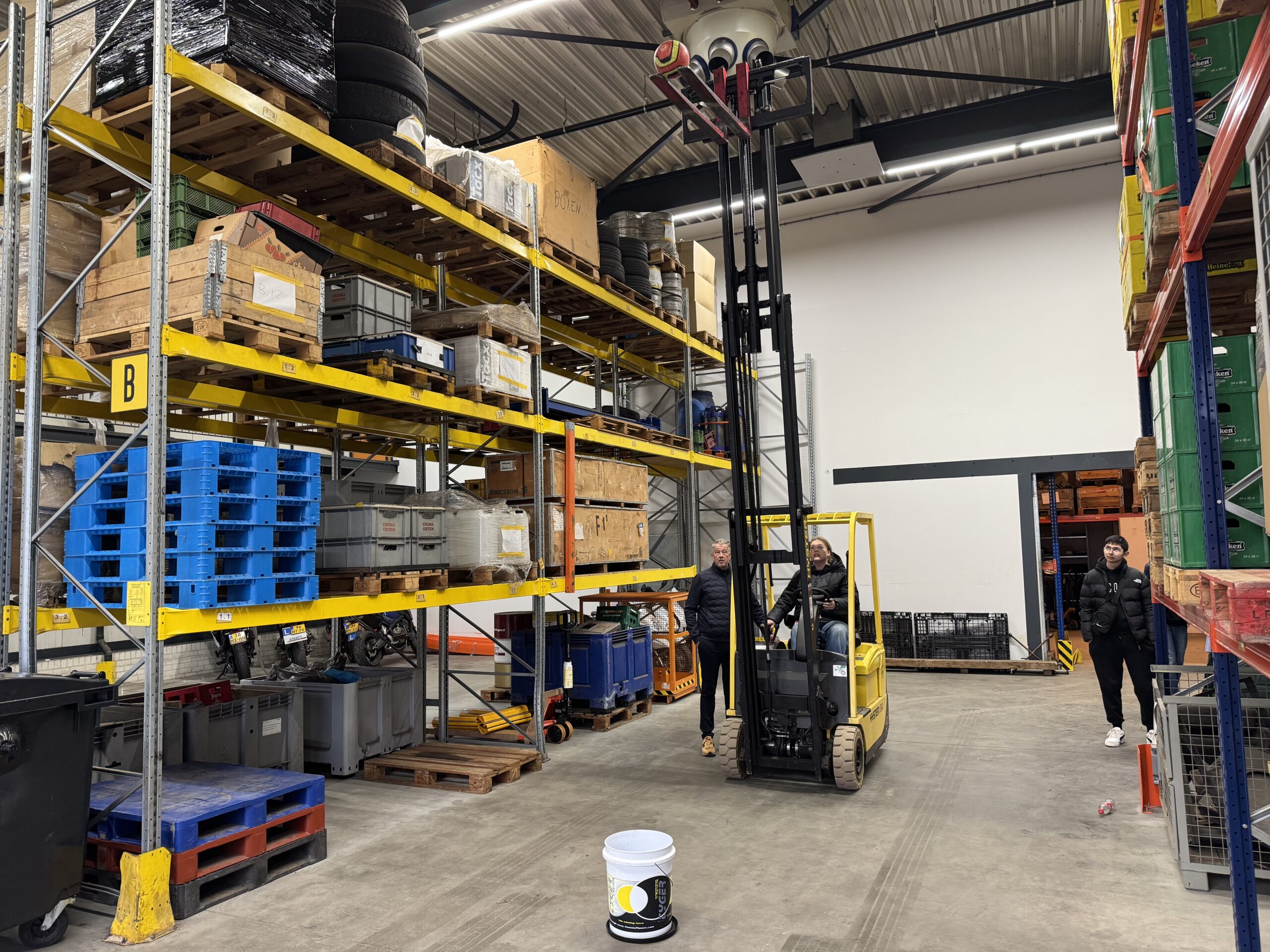 Vervolgens mochten ze zelf aan de slag. Ze stapten in een vrachtwagen, leerden hoe je zo’n groot voertuig bestuurt en oefenden met het rijden op een heftruck. Een speelse opdracht – een bal in een emmer krijgen met de vork van de heftruck – zorgde voor veel plezier én bewondering voor het vak.