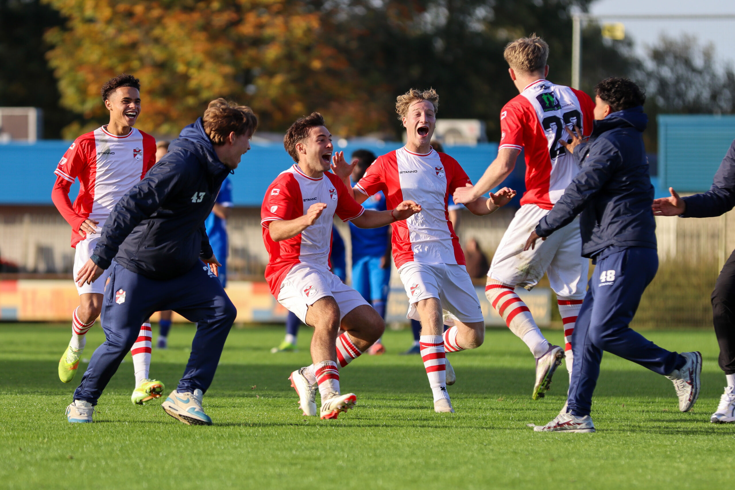FC Emmen O21 nam het op eigen veld op tegen FC Twente/Heracles O21 en zorgde voor een bekerstunt. Na een 2-2 eindstand sloeg FC Emmen O21 toe in de strafschoppenserie (4-2). FC Twente/Heracles O21, dat twee divisies hoger uitkomt, kwam na twintig minuten spelen op een 0-1 voorsprong, maar tien minuten later maakte Chiel Sunder weer gelijk. Stan van Manen had even later de 2-1 op de voet, maar hij kreeg de bal niet in het doel. De Emmenaren kwamen na rust sterk uit de kleedkamer, maar de 2-1 bleef opnieuw uit. Aan de andere kant waren de Tukkers na een uur spelen wel trefzeker en werd het 1-2. De 15-jarige Dylano Hof, die zijn debuut maakte onder de lat bij de onder-21, redde eerst nog, maar in de rebound ging de bal alsnog in het doel. FC Emmen O21 gaf niet op en vocht zich terug in de wedstrijd. Aanvoerder Dim Otten was dichtbij de gelijkmaker, maar zijn uithaal werd nog gekeerd door de doelman van de gasten. Even later viel alsnog de 2-2. Chiel Sunder kreeg na een scrimmage de bal voor zijn voeten en maakte zijn tweede van de middag. Het bleef bij 2-2, waardoor strafschoppen de beslissing moesten brengen. Beide ploegen misten de eerste strafschop (Ties Oostra namens FC Emmen O21). Vervolgens waren Gijs Bolk, Chiel Sunder, Stan van Manen en Thom Bijkerk wel trefzeker vanaf de stip. Door een misser van voormalig FC Emmen-jeugdspeler Emmanuel Owusu won FC Emmen O21 uiteindelijk na strafschoppen. Een zeer knappe prestatie, de ontlading was na afloop dan ook groot.