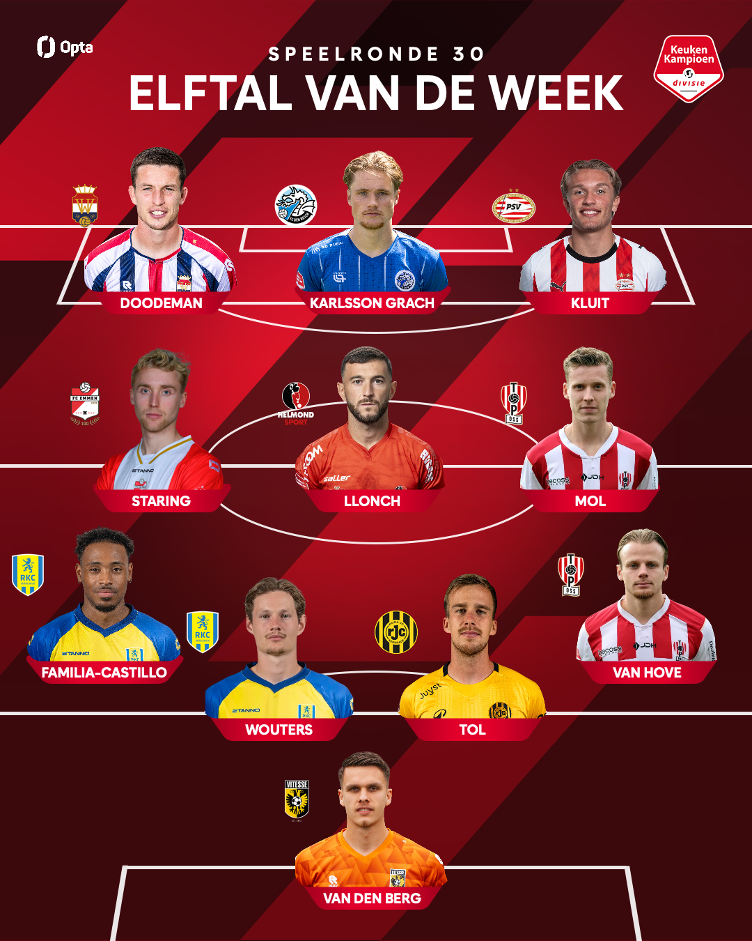 Casper Staring is opgenomen in het Elftal van de Week van de Keuken Kampioen Divisie. De middenvelder dankt zijn uitverkiezing aan zijn sterke optreden in de gewonnen uitwedstrijd tegen Jong AZ (2-3).